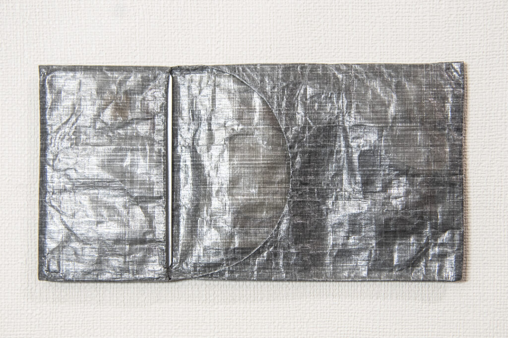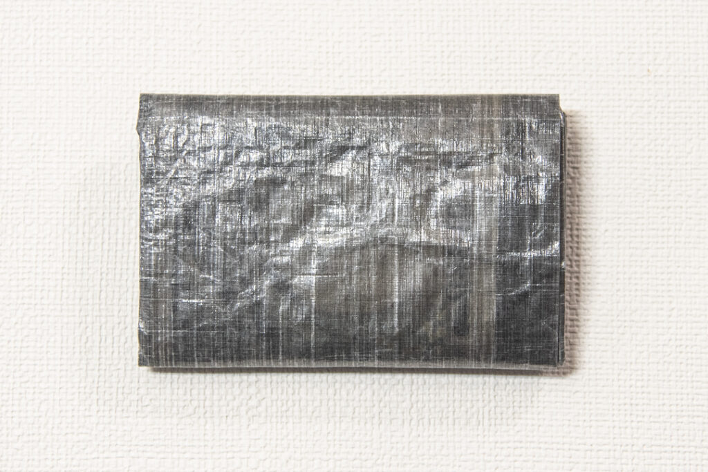 前回の試作品は、二つ折りデザインで、極力サイズを小さく、お札が収まるギリギリラインを攻めた結果、DCF素材の経年変化(縮み)により、お札がはみ出してくることがわかった。また、二つ折りだとカードの収納部分に余白が大きくなるため、今回は三つ折りデザインとし、折りたたむとコインが落ちにくい状態をつくるデザインとした。更に、前回はDCF素材を切りっぱなしの一枚折り曲げ構成で作成したため、軽量ではあったがホツレが生じてしまったので、今回は二重にして作成した。