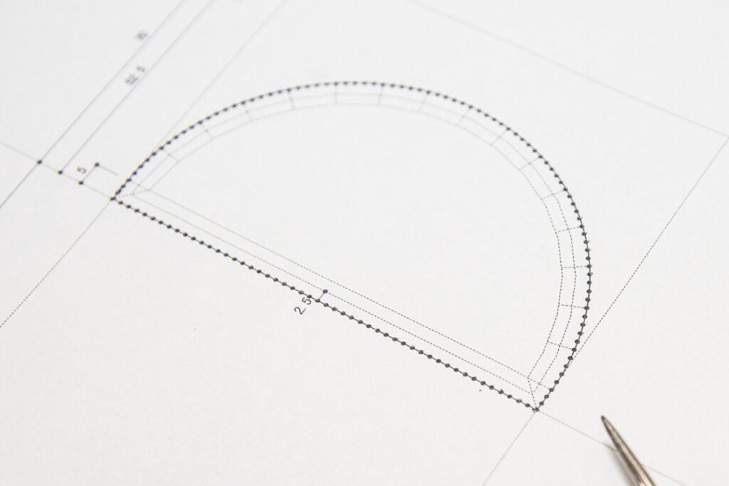 半円部分は手縫いとしたためドットを描き込み、ニードルで呼び穴を開けた。