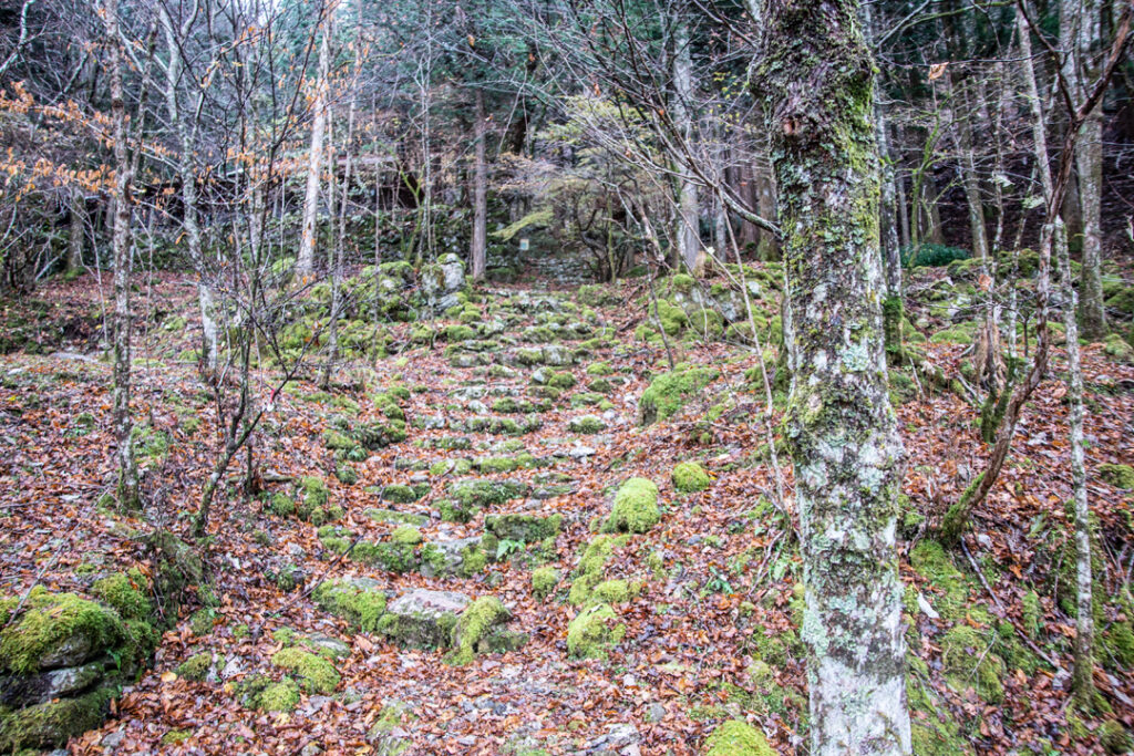 最初の分岐点手前。石積と石の階段が現れます。