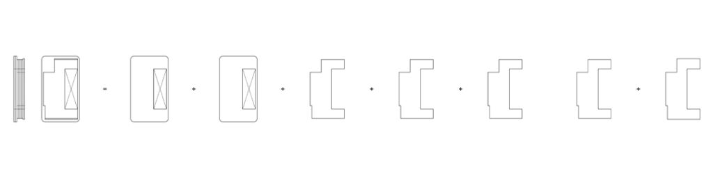 まずは図面を描きます。もともとついていたカバーと取付穴を採寸して、形を決定。奥行寸法などから、切り抜いた合計7枚のシートを貼り合わせて一体化し取付ける計画とした。